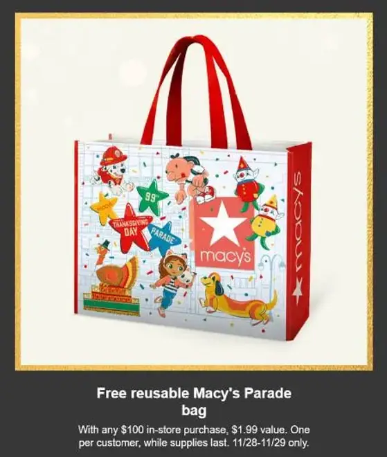 Shop in store and get a free reusable Macy's Parade bag with any $100 purchase.